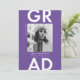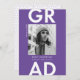 Elegantes y modernas invitaciones para una fiesta de graduación fotográfica con "Grad" en letras blancas en negrita, fondo morado y un patrón geométrico de moda en la parte posterior. Personalice las invitaciones a la fiesta de graduación agregando la foto, el nombre, la escuela, el año de graduación y los detalles del fiesta.