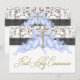 Invitaciones de primera comunión para niños con cruz negra azul y dorada. Invitaciones de primera comunión con damasco azul y negro. Personalice con los detalles de su evento, estilo de fuente, tamaño y color de la fuente y redacción.
