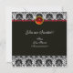 Elegante, con clase, diseño floral único, claveles blancos y negros con una brillante gema 3D rubí. Puedes mover la gema para personalizar con tus iniciales y texto propio como un anuncio de boda, tarjetas de lugar, save-the-date, compromiso romántico, tarjetas de agradecimiento, despedida de soltera, fiestas de cumpleaños sweet 16, aniversario, graduación o casi cualquier evento que desees.