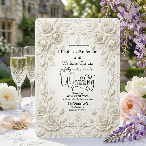 An elegant white and gray floral composition with sculpted depth, formal typography, and timeless symmetry—designed for refined wedding stationery aesthetics.This design features a monochromatic white and soft gray palette (cool whites with subtle neutral shadows) arranged in a balanced, formal layout. Sculpted roses and hydrangea florals appear in a faux embossed plaster bas-relief style, framed by an ornate filigree border, with interlocking monogram circles and classic serif typography paired with flowing calligraphy script for hierarchy and contrast.