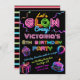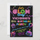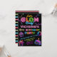 Coloridas invitaciones de fiesta de cumpleaños "Glow crazy". Cuenta con fuentes neon, streaming, pastel de cumpleaños, quequitos, globo y regalo sobre un fondo negro. Barras de color neón en la parte trasera. Las palabras "Brillo y fiesta de cumpleaños" no se pueden cambiar pero se pueden borrar. Para realizar más cambios, vaya a Personalizar esta plantilla. En la parte inferior verás "¿Quieres personalizar este diseño aún más? Haga clic en la herramienta EDIT using Design. A partir de ahí puede cambiar algunas fuentes y algunos colores, mover cosas o borrar lo que necesita.