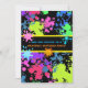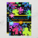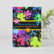 Invitación de la fiesta de Paintball con colores vivos de verde, amarillo, violeta, rosa, naranja y rojo.
