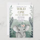 Celebre nuevos inicios con nuestra invitación neutra de temática safari con elefantes dibujados a mano y follaje acuático. Personalizable completo de texto/colores. Perfecto para los padres amantes de la naturaleza que buscan una elegancia neutral en cuanto a género.