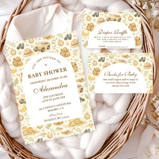 A sweet storybook-style safari design featuring gentle watercolor baby animals including lions, giraffes, and elephants surrounded by soft jungle greenery and a delicate botanical background. The warm neutral palette of cream, honey gold, and soft olive creates a timeless nature-inspired aesthetic, while the elegant arched layout provides a beautiful space for event details.