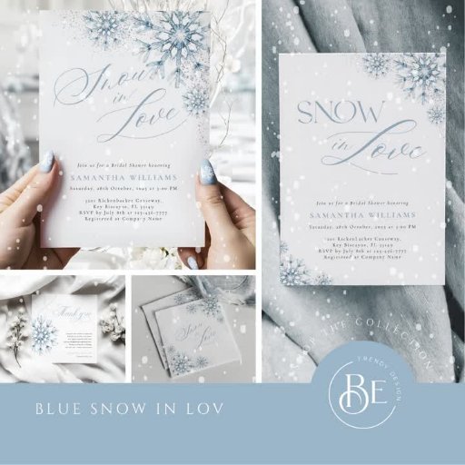 Añade un toque de magia de invierno con nuestra Invitación a la ducha de la nieve azul en el amor. La polvorienta paleta de colores azul y los delicados copos de nieve acuarela evocan un ambiente tranquilo e invernal, mientras que los acentos purpurinas plateados aportan brillo a la celebración. Con un elegante guión caligráfico, este diseño moderno y de moda es perfecto para una ducha de novias Navidades con un tema de invierno. Personalizar el texto para crear una invitación única para tu evento especial.