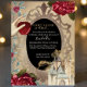 Esta mágica y encantadora invitación a la fiesta presenta un tema de cuento de hadas de Blancanieves. Un espejo mágico dorado se sitúa al otro lado del frente, con el texto en el centro. La clásica frase de un cuento de hadas de la Época se imprime en la parte superior en una tipografía de oro caprichosa. Un hermoso castillo de princesas se coloca en la parte inferior derecha, y una imagen de la mano de Blancanieves sosteniendo una manzana venenosa se imprime en la parte superior izquierda. Las rosas rojas acentúan los bordes de la invitación. El fondo es un diseño rústico de papel pergamino que recuerda a un libro de cuentos antiguo.