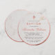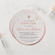 Hay un marco redondo de oro rosa en ambos lados y una cruz de oro rosa encima del texto - ambos de lámina de oro rosa falsa. La ocasión "Bautismo" y el nombre están en rosa, el nombre está escrito en una escritura caligráfica.