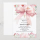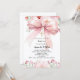 Un fondo blanco, decorado con un lazo grande rosa y, una cruz dorada y flores rosas. Personalice y agregue un nombre y detalles detalles.