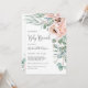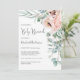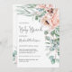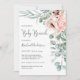 Una hermosa invitación de baby brunch femenina que presenta un ramo en la esquina de amapolas, rosas, eucalipto y follaje colgante en acuarela en beige pastel, rosa, verde y verde azulado. Las combinaciones de tipos de letra de moda incluyen escritura a mano y serif elegante. Hay texto especial en el reverso de la invitación con una solicitud de "Libros para el bebé". Esta invitación es una excelente opción para la futura madre que espera una niña. Personalice la plantilla de texto fácil de usar con los detalles de su evento.