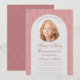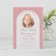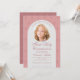 Una invitación moderna de bautizo para el bautizo de una niña. Sobre un fondo rosa polvo con un patrón de cruces pequeñas y oscuras de rosa polvo, tiene un arco blanco con una foto redonda de una niña y texto rosa polvo en el interior. La ocasión Primera Comunión y el nombre están escritos en una elegante letra caligráfica; la primera línea, encima de la foto, es texto arqueado. En la parte posterior, el patrón está invertido, con cruces rosadas más claras sobre un fondo rosa polvo más oscuro.