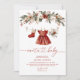 ¡Santa Bebé! Una invitación de Baby Shower con tema navideño festivo que incluye vestido rojo de bebé, calcetín y vegetación navideña con fuentes rojas.