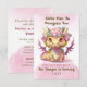 ¡Las niñas también pueden ser dragones! El dragón rosa y amarillo más lindo de ojos grandes invita a sus amiguitos a una fiesta de cumpleaños, y vestido con ropa de dragón (si se puede). Nubes rosadas en la parte superior e inferior de esta invitación con texto intercambiado entre colores verde y rosa.