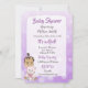 Invitaciones de baby shower para niña hispana o afroamericana con oso de peluche y fondo morado.