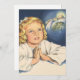 Ilustración religiosa de diseño vintage con un retrato de una joven niña rubia rezando antes de acostarse y soñando con Jesucristo.