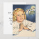 Ilustración vintage de diseño religioso que presenta un retrato de una joven niña rubia rezando antes de dormir y soñando con Jesucristo.