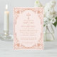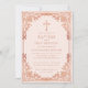 Esta elegante invitación de bautizo y primer cumpleaños en rosa oro y rosa claro con un aire vintage, recomendada para niña, tiene un marco de (falso) foil de rosa oro ornamentado con decoraciones barrocas elegantes sobre un fondo rosa claro. Sobre el texto hay una cruz religiosa en rosa oro. Todo el texto se puede personalizar y tiene un color similar al marco de rosa oro.