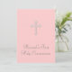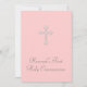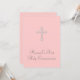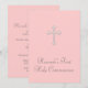 Bonito rosa pálido con elegante cruz en la parte delantera y trasera invitación de niña para la Primera Comunión. Esta elegante invitación de primera comunión con cruz rosa se personaliza fácilmente para su evento añadiendo los detalles del evento, estilo de fuente, tamaño y color de la fuente, y redacción.