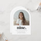 Una simple invitación para cumplir 9 años con tu propia foto en forma de arco y las palabras 'nueve.' debajo. Puede añadir su propia foto rápida y fácilmente en este diseño.