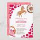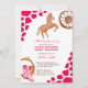 Pequeña cowgirl de rodeo occidental de la ducha de bebé plantilla de invitación de descarga instantánea. Caballo de bebé palomino marrón, rueda, botas de cuerda y vaquero, patrón de vaca, fuente vintage occidental y escritura de pincel moderno. Color rosado para una bebé con tema de vaquera en la ducha de bebé.