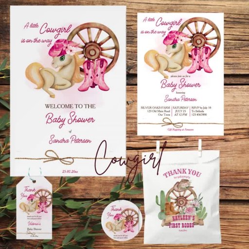 Niñita vaquera en el camino caballos equitación occidental rancho de granja de bebés modelo de invitación a ducha. Caballo beige lindo con un gorra de vaquera rosado, botas rosadas, una rueda, escritura rosada y una cinta túnica. Muy agradable para los amantes de los caballos, es fácil hacer una temática fiesta, mezclar y combinar con la decoración.