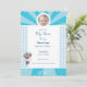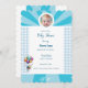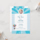 Invitación alegre para baby shower con colores blanco y azul. Coronada con un bebé volando llevado en globos. Un hermoso recuerdo de la ocasión más hermosa