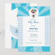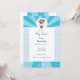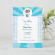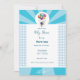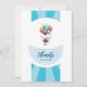 Invitación alegre a baby shower en color blanco y azul. Encima un bebé volando llevado en globos. Un hermoso recuerdo de la ocasión más hermosa