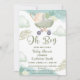 Esta invitación a la ducha de bebé, nubes acuarelas, incluye carrito de bebé de color verde oliva con globos y nubes y hojas de acuarela con fondo de color verde menta y verde oliva.