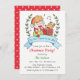 Una invitación de fiesta para Navidades que pondrá una sonrisa en la cara de los destinatarios. Presenta a un chico lindo vestido con las muelas de las orejas, bufanda y chaqueta cantando villancicos de Navidades con un reno que se aferra a un libro de canciones de Navidades. Coraje decorativo y banner para la personalización del saludo de vacaciones. Al revés hay un patrón de puntos de polka sobre un fondo rojo. Personalice fácilmente los datos de su fiesta.