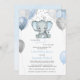 Esta adorable invitación a la ducha para bebés incluye elefante azul y gris con globos y confeti. El reverso presenta una suave acuarela azul. Fácilmente personalizado para su evento haciendo clic en personalizar.
