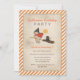 Invitaciones para la fiesta de cumpleaños de los niños de Halloween, de rojo_dress, presentando las palabras, en naranja y marrón, "fiesta de cumpleaños de Halloween", un ilustracion vintage de bruja linda en escoba, con un pequeño gato negro, y la cara llena de luna tiritando. La niñita, disfrazada de bruja en escoba, lleva el gorra de una bruja negra, capa roja, vestido crema, con puntos azules claros, zapatos negros lindos y calcetines a rayas (beige y azul suave).