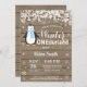 Invitación de primer cumpleaños del niño pingüino rústico de Onederland. Copo de nieve blanco. Invitación a fiesta de cumpleaños. Día feriado de invierno. Fondo De Madera Rústica. Barniz Retro Vintage del País.