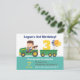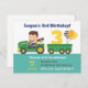 Un chico lindo conduce un tractor verde mientras que el cachorro disfruta del paseo. El tractor está tirando de un carro con globos y un número 3. Perfecto para los chicos que aman los vehículos tractores y están celebrando su tercer cumpleaños. Personalice los datos de su fiesta, incluido el número del carrito.