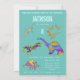 Dinosaurio infantil personalizable 8ª invitación de fiesta de cumpleaños con un tema verde. Una colección de coloridos y psicodélicos dinosaurios incluyendo Tyrannosaurus rex, velociraptor, stegosaurus, brontosaurus y pterodáctilo le invitan a una divertida fiesta de cumpleaños de dinosaurios Jurásicos. Esta divertida invitación a fiestas es fácil de personalizar para crear una invitación única para fiestas para niños, chicas e incluso adultos amantes de los dinosaurios. Coloridos ilustraciones psicodélicos de dinosaurios de la artista Catherine Sweetman