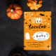 Invitación a la fiesta de cumpleaños de Halloween con Spooktacular escrito en una combinación de fuentes divertidas, los dobles en el espanto diseñados para parecerse a ojos grandes. El texto está rodeado de estrellas, arañas y un murciélago. Y un bonito fantasma les dice a sus invitados el nombre y la edad del niño de cumpleaños. La parte posterior presenta rayas coincidentes en negro, blanco y naranja.