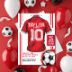 ¡Puntee en grande con la invitación a la fiesta de cumpleaños de nuestros niños! Perfecto para los jóvenes atletas que viven y respiran fútbol, esta invitación seguramente iniciará las festividades de cumpleaños con estilo. Con una vibrante camiseta de fútbol y una clásica pelota de fútbol en varios tonos de rojo y blanco, prepara el escenario para una celebración repleta de acción en el campo. Ya sea que esté hospedando a un fiesta de fútbol en un parque local o un centro deportivo, esta invitación promete entusiasmar a los jóvenes hinchas de fútbol e inspirar horas de diversión y juegos. Invite a sus compañeros de equipo y amigos pequeños a unirse al espectáculo de fútbol y crear recuerdos que durarán toda la vida. Puede transferir este encantador diseño a una variedad de productos sin esfuerzo. Simplemente desplácese hasta la sección designada llamada 'Transferir diseño a un producto' para aplicarlo a sus artículos preferidos. ¿Necesita más productos para completar su tema de fiesta de cumpleaños? Sin más. Siéntase libre de enviarnos un mensaje, y le ayudaremos con mucho gusto a añadir productos adicionales adaptados a sus necesidades de celebración. Su satisfacción es nuestra máxima prioridad, y estamos aquí para asegurarnos de que su evento sea espectacular. Visita nuestra tienda para más diseños!