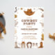 Invitación a la fiesta de cumpleaños de los chicos con temática de vaquero. Los símbolos de vaquero bordean los tonos marrones sobre un fondo blanco.