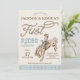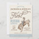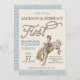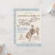 Boys Blue Gray Twins First Rodeo Invitación de primer cumpleaños Invitación de niño dulce de primer rodeo de color gris marrón y azul con tema de primer cumpleaños invitación a los gemelos con un vaquero y un caballo, encabezado de texto con estilo de cuerda y patrón de chapa de búfalo o gingham.