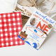 Niños Pescadores Azules Estamos entusiasmados con la invitación de primer cumpleaños. Chicos, chicos que pescan con la invitación de cumpleaños con la temática de una gran palabra roja, caña de pescar, peces pequeños, caña de pescar y gorra. La foto de los niños pequeños aparece en el marco redondo que sustituye a la de uno.