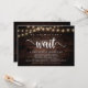 No podíamos esperar, Tarjeta de anuncio de fuga / invitación de boda, en diseño de luces de cuerda de madera de granja rústica. Esto es perfecto para la recepción de su boda y la fiesta de celebración después de la boda. Agregue sus datos en letra / letra coincidente.