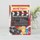 Con carretes de películas retro y película y palomitas de maíz, soda, boletos y gafas 3D. Esta invitación viene en varios colores de fondo, incluyendo rosa, morado y azul.