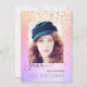 Una invitación para una fiesta sorpresa de cumpleaños número 21 (o cualquier edad). Personaliza y agrega tu propia foto. En la parte delantera: Texto gris oscuro sobrepuesto: ¡Shhh! Es una sorpresa. El texto está escrito con una escritura de estilo con letras a mano moderna. Texto: 21º cumpleaños. Decorada con rosa falso de oro rociado con diamante. Un fondo de diseño de color arcoiris en oro violeta, rosa y rosa. Fondo de color arcoiris, diamantes falsos y letras de color gris oscuro. Personalice y agregue los detalles de nombre y fiesta.