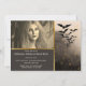 Un marco sombrío y nocturno en tonos negros, crepúsculos y sepias tiene luciérnagas doradas suaves resplandecientes detrás de la silueta de una colonia de murciélagos. Una plantilla de fotos con tonalidades sepias se encuentra encima de las plantillas para su redacción personalizada y la parte posterior tiene los mismos tonos de acuarela abstractos con murciélagos en la esquina superior izquierda. Ideal para eventos de fiesta de disfraces de Halloween; para fiestas temáticas de cumpleaños o brujas que se reúnen.