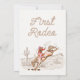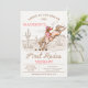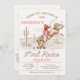 Invitación a los primeros días del rodeo de Cowgirl Brown Primeros chicas predominantemente marrones invitaciones de cumpleaños de rodeo por primera vez presentando una vaquera sobre un caballo, un paisaje del desierto occidental y un texto de estilo de cuerda. Esta invitación a los chicas para el cumpleaños de rodeo también tiene toques de rosa y naranja.