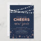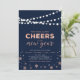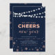 Celebre el primer día del nuevo año con esta moderna invitación de la fiesta de Año Nuevo. Este diseño presenta la tipografía "Cheers to the new year" (Vientos al nuevo año), falsos copos de nieve de oro rosa y luces de cuerda en un fondo azul marino. Puede personalizar el texto y el color de fondo.