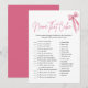 Agrega un toque encantador a tu fiesta de compromiso con nuestro juego "She's Tying the Knot" (Ella está atando el nudo) con lazo rosa para adivinar el nombre de la torta. Este juego encantador desafía a los invitados a adivinar los nombres de diferentes tortas, provocando risas y una competencia amistosa. Con su adorable diseño de lazo rosa, este juego añade un toque de elegancia a tu celebración mientras crea momentos inolvidables para la futura novia y sus invitados. ¡Que comience la diversión mientras todos tratan de adivinar los nombres de las tortas más dulces!