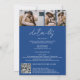 Una moderna, moda y elegante invitación a la boda con nombres de arco, guiones con una caligrafía escrita a mano en color azul del año y blanco con una foto arcada y otras 3 fotos en la parte posterior. Un todo moderno en una sola invitación de boda con rsvp, detalles, alojamiento y código qr. Todos los colores del texto, los nombres y el fondo son personalizables. Una invitación simple y minimalista.