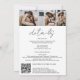 Una moderna, moda y elegante invitación a la boda con nombres de arco, guiones con una caligrafía escrita a mano en blanco y negro con una foto arqueada y otras 3 fotos en la parte posterior. Un todo moderno en una sola invitación de boda con rsvp, detalles, alojamiento y código qr. Todos los colores del texto, los nombres y el fondo son personalizables. Una invitación simple y minimalista.