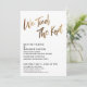 Invite a sus invitados a la celebración de su boda con la ayuda de estas sencillas tarjetas de invitación. Para el encabezado, he utilizado una fuente manuscrita moderna y casual para crear una superposición de tipografía gráfica que dice "We Tied The Knot". Esta imagen fue embellecida con un efecto de lámina de oro falso suave para un resultado festivo. Rellene los espacios en blanco del modelo con sus datos para personalizar el diseño. Todas las capas se dejaron desbloqueadas para que pueda hacer clic para personalizar aún más y reposicionar el texto o incluso cambiar los tamaños o las fuentes. Cambie el fondo a cualquier color que prefiera. Alternativamente, puede elegir agregar una imagen al dorso. Por favor, no dude en hacérnoslo saber si necesita ayuda con la personalización.