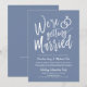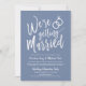 Después del gran día y del intercambio de anillos, invite a sus invitados más honorables a una celebración después de la boda. Esta invitación presenta las palabras "Nos estamos casando" en letras de escritura elegante sobre un fondo de color azul paloma. Hacia un lado de esto hay un par de anillos de boda. Debajo de este gráfico único hay un espacio para sus propias palabras e información para su evento posterior a la boda.
