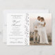 La Invitación del Boda blanco de foto de corazón de Purpurina casada presenta su foto personalizada y los corazones amorosos románticos purpurinas plateados en un fondo blanco con la información de su invitación boda a la izquierda. Personalice editando el texto en el cuadro de texto proporcionado.